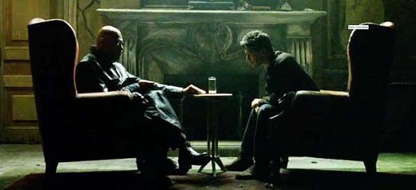 The Matrix is built around the outlandish idea that the world is a computer simulation, and that there is a dystopian “real world” to wake up to. We are introduced to this concept in the scene where Neo meets Morpheus. Everything about this scene is terrific. The set it lit to make Morpheus look mysterious. We hear the sound of rain and thunder in the background. There are pauses in the dialogue to allow the audience to take in the moment.